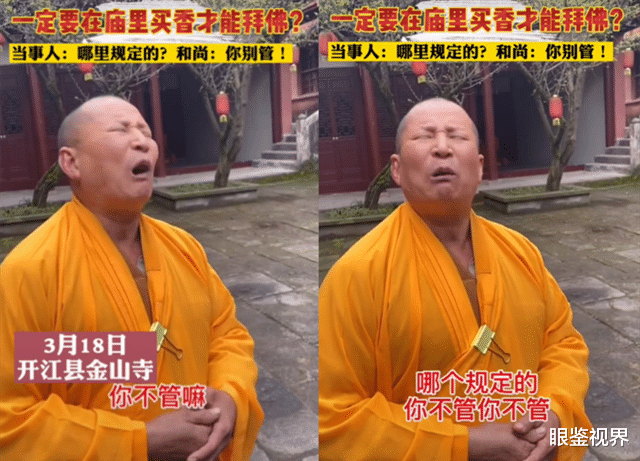 遇到了这种奇葩事女游客自然非常愤怒。“凭什么我不能烧自己的香?哪里规定的?”女游客不解地问道。“你别管!”和尚非常不耐烦地回怼到。女游客表示非常委屈,自己诚心拜佛却换来的是被所谓的僧人拒之门外。
