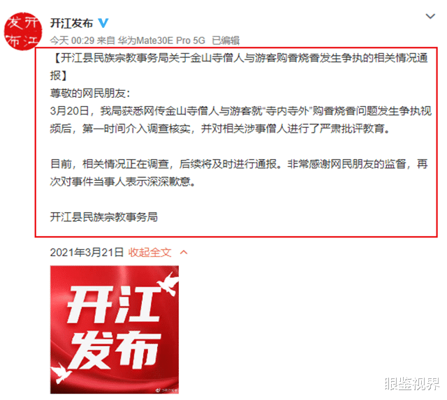 对此四川省达州市开江县民族宗教事务局就“金山寺僧人与游客购香烧香”事件发布通报:已经在第一时间介入调查核实,并对相关涉事僧人进行了严肃批评教育。