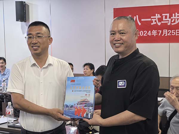 刘建国讲了父亲研制八一式马步枪的故事。他说,父亲刘贵福在“不断创新、鼓励冒险、宽容失败、讲究合作”的延安创新精神指引下,在尊重人才、尊重创新、尊重科学的延安军工、太行军工三大尊重精神的激励中,夜以继日的加班加点,在一穷二白条件和艰苦卓绝的环境中,制造出无名式马步枪,毛泽东主席看到后,爱不释手,拿着枪摸了又摸,举起枪瞄了又瞄。毛泽东给刘贵福题词,刘贵福同志你是生产战线上的英雄。为此,党中央毛主席决定在太行山建立兵工厂,用附近的铁轨造枪造炮。于是,刘贵福身背支无名式马步枪,千里迢迢来到黄崖洞,一边将无名式马步枪稍加改造加上了可调准星(被彭德怀命名为天下第一准星)和防尘罩,于1939年3月完成,被彭德怀命名为八一式马步枪。”