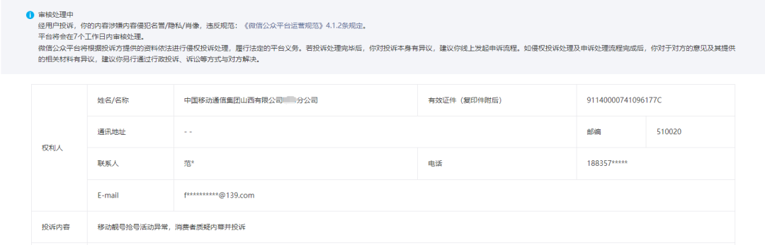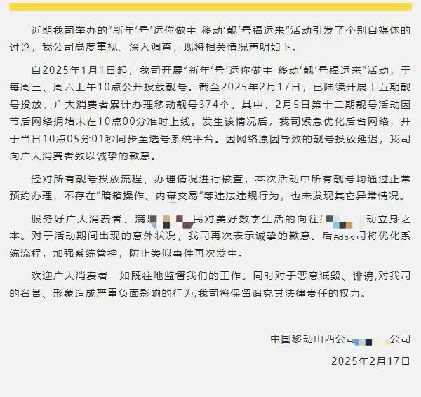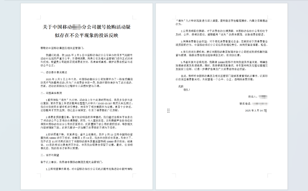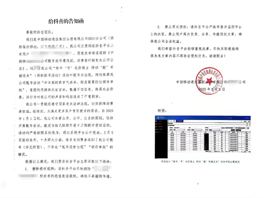 面对消费者的质疑,移动公司并未直接回应核心问题,反而对一篇揭露此事的文章提出了侵权投诉。更让消费者感到困惑的是,他们接到了两个来自不同陌生号码的解释:一是移动公司方面否认了存在任何问题;二是投诉删稿函中声称已有消费者成功选到了“靓号”;三是外包公司表示这是由于系统延迟导致的意外情况。这些相互矛盾的说法让消费者如坠雾里,更加坚定了他们维权的决心。