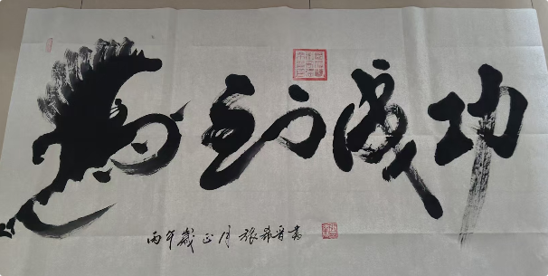 此作为张希晋先生丙午马年开年扛鼎之作,以书画同源为魂,首字“马”以大写意泼墨塑形,枯笔写鬃,浓墨立骨,字中有马、马中见字,奔腾之势跃然纸上。右侧“到成功”以狂草挥就,笔走龙蛇、气脉贯通,与左侧写意“马”字动静相生、形意互映,熔书法线条美与绘画造型美于一炉,堪称当代创意书法典范。